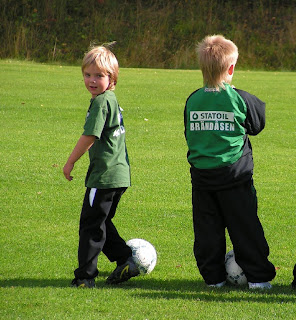 Idag gick det bättre för E att komma igång med träningen och hon verkar vilja fortsätta. Lyckades rota fram W gamla fotbollsskor och träningströja. Idag blev det ju finare väder mot vad det var igår. Det är alltid lika kul att se när dem får provspela match och alla springer i en enda stor klunga och jagar bollen :) Alla vill ha den. Och alla vill gärna stå i mål också..*fniss*
