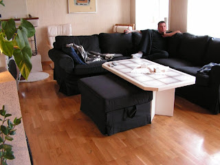 Ja, kanske kanske kommer jag att få min scraphörna ändå,…ja innan barnen har fyllt 18 år och flyttat hemifrån alltså :) Vi har köpt en ny soffa i dagarna och ställt den på detta vis. Såg ett bord på Ikea som kan passa bra bakom soffan där jag sen kan sitta och skapa mina fantastiskt fina LO´s…eh-he, ja försöka i.a.f *lol* Kan inte sluta titta på min senaste LO ”Jag kan cykla” och känna att…den är ju inte alls så där fin som jag upplevde den när jag var klar…suck…Men i.a.f så bakom soffan står det nu två stolar som inte ska vara där sen, och vårt gamla Mio-bord ska bytas ut, för det passar inte riktigt in där. Behöver nog ett litet mindre, runt kanske..
