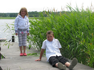 Sen när alla kommit åt vi sill o färskisar. Vädret var ju typiskt midsommarväder, sol o regn o sol o moln, ja ni vet. Typiskt bara att det skulle regna just som vi satt på grillen…tog lite tid för köttet. Men å så gott det var sen med fläskfilé, tzatziki, vitlöksbröd och hemmagjord potatissallad med jordgubbar…mumma! Kanske låter konstigt med jordgubbar i potatissalladen men det var vansinnigt gott. Lite senare gick vi ner till sjön, några bada, andra inte ;) Sen hem igen och kvällen avslutades med att skämma ut sig i SingStar…haha.