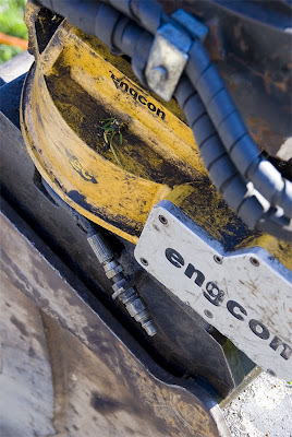 Jaja, jag vet ju vem som har grävt i vår trädgård. Det har tiltrotatorn hjälpt till med. De håller på att gräva ner fiber åt oss. Så jag var ju tvungen, efter viss tvekan, att fota lite. När bilden sen kom in i datorn så undrar jag lätt ”vad är det för nåt jag har fotat egentligen”?…så jag var tvungen att forska lite eftersom det fanns ett märke med i bilden. Ni ser på bild en tiltrotator vilken ska vara som en typ av handled åt grävskopan. Vill ni läsa mer..? klicka här. Hur som helst så gillar jag ju detaljbilder, men jag tyckte att denna krävde lite explanation :)